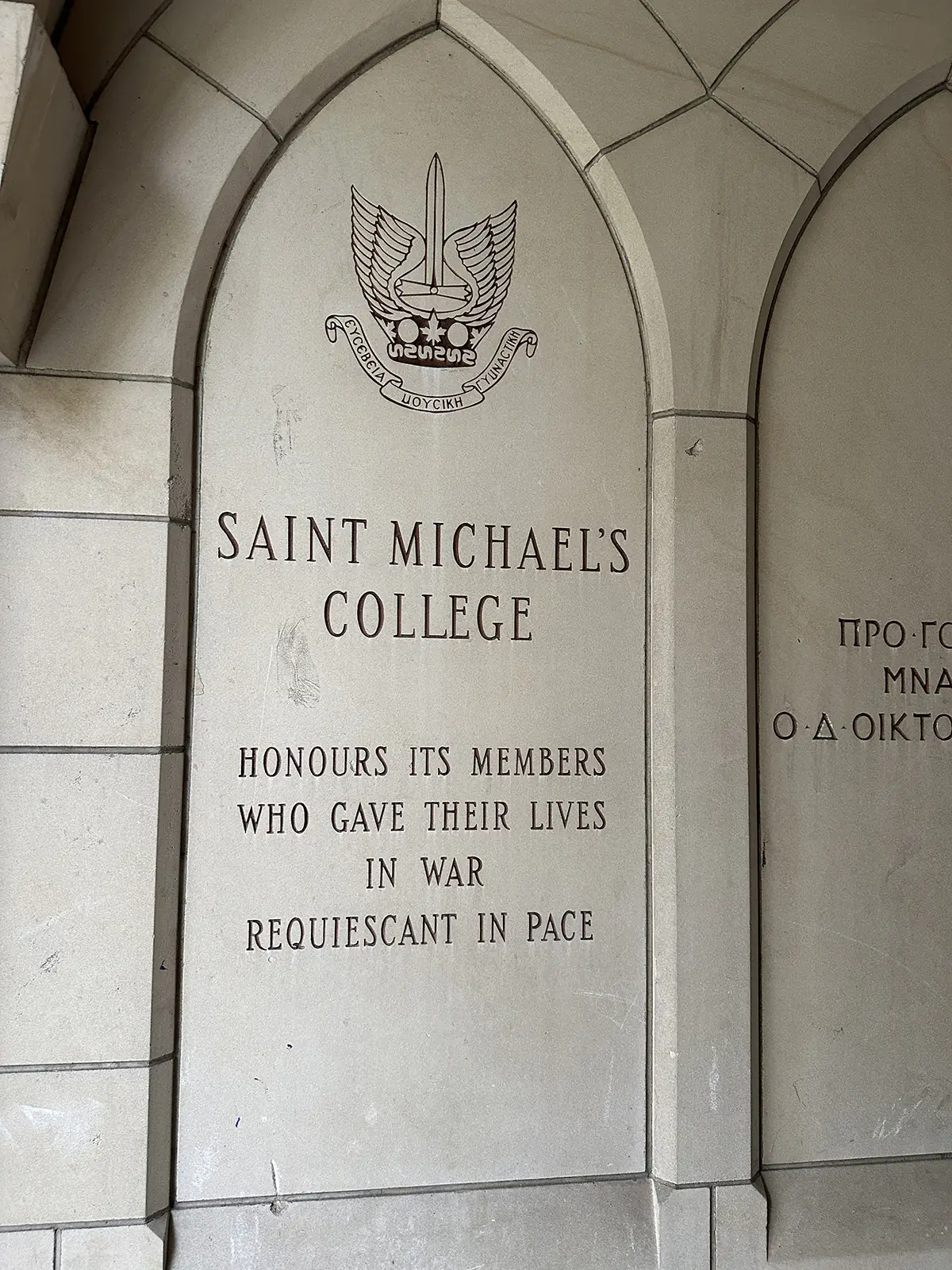 At St. Michael’s, we remember the more than 150 students and graduates who sacrificed their lives in World War I, World War and the Korean War. Their names are permanently etched into the Soldiers’ Memorial Slype, the sandstone archway between Fisher House and More House., their names visible year-round as a lasting tribute to their courage and service.