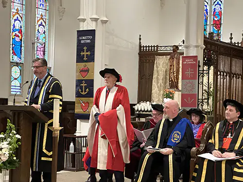 For the first time, graduates of St. Mike’s and Regis convocated in a joint ceremony on November 8. Graduates were warmly welcomed and congratulated by their respective Chancellors: Archbishop Cardinal Frank Leo (St. Mike’s) and Fr. Jeff Burwell, SJ (Regis). Fr. Michael Kolarcik, SJ delivered a heartfelt convocation address in St. Basil’s Church, touching on a range topics with a focus on peace and justice. Sr. Dr. Carla Thomas, OP, was awarded this year’s Governor General’s Award.