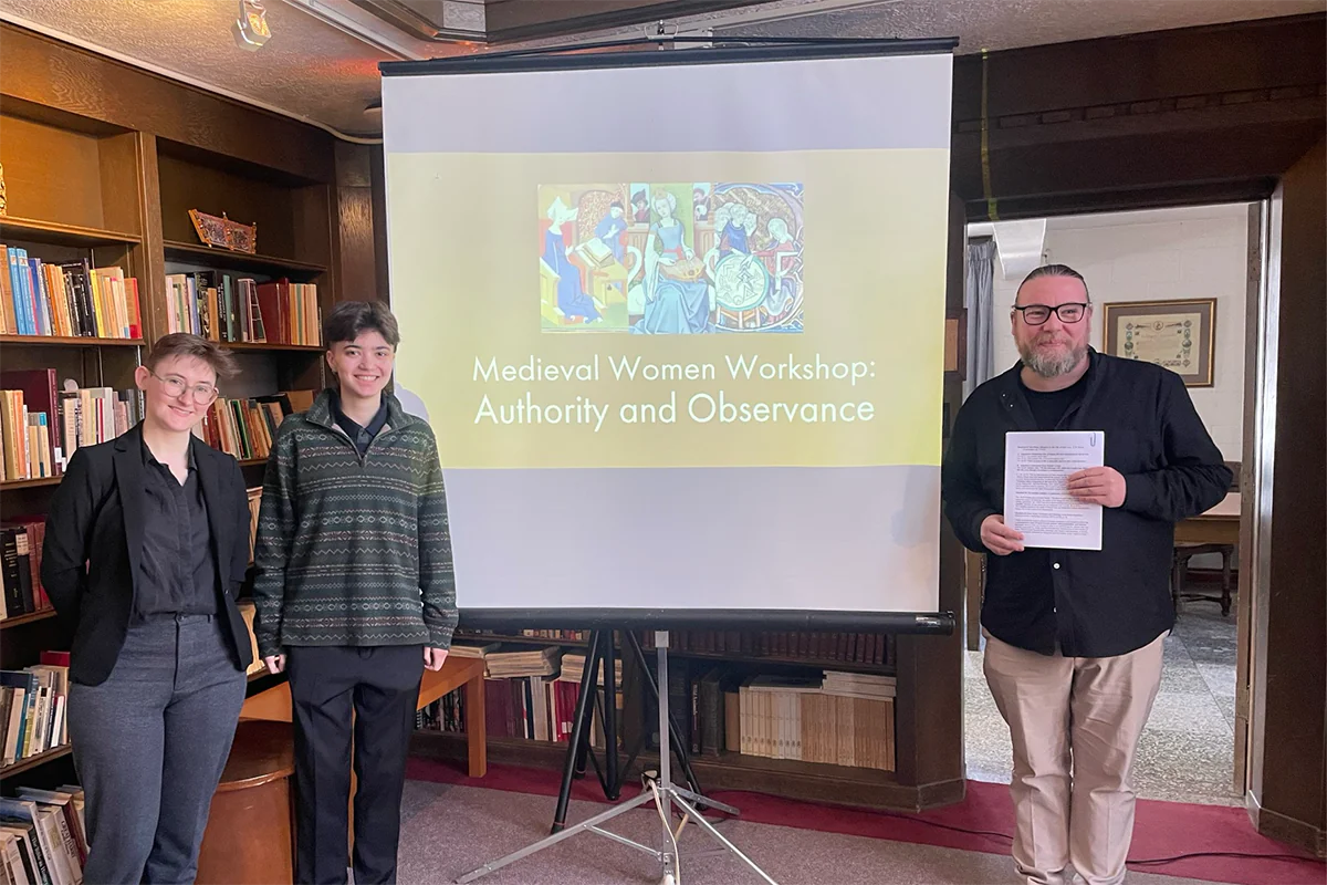 The workshop also featured two St. Mike’s Medieval Studies undergraduates — Meagan (Meg) Mellor, who presented on women performers in Chester’s medieval drama, and Annika Rempel, who explored female audiences in Bernard of Clairvaux’s Sermons on the Song of Songs — presenting alongside fellows and faculty.