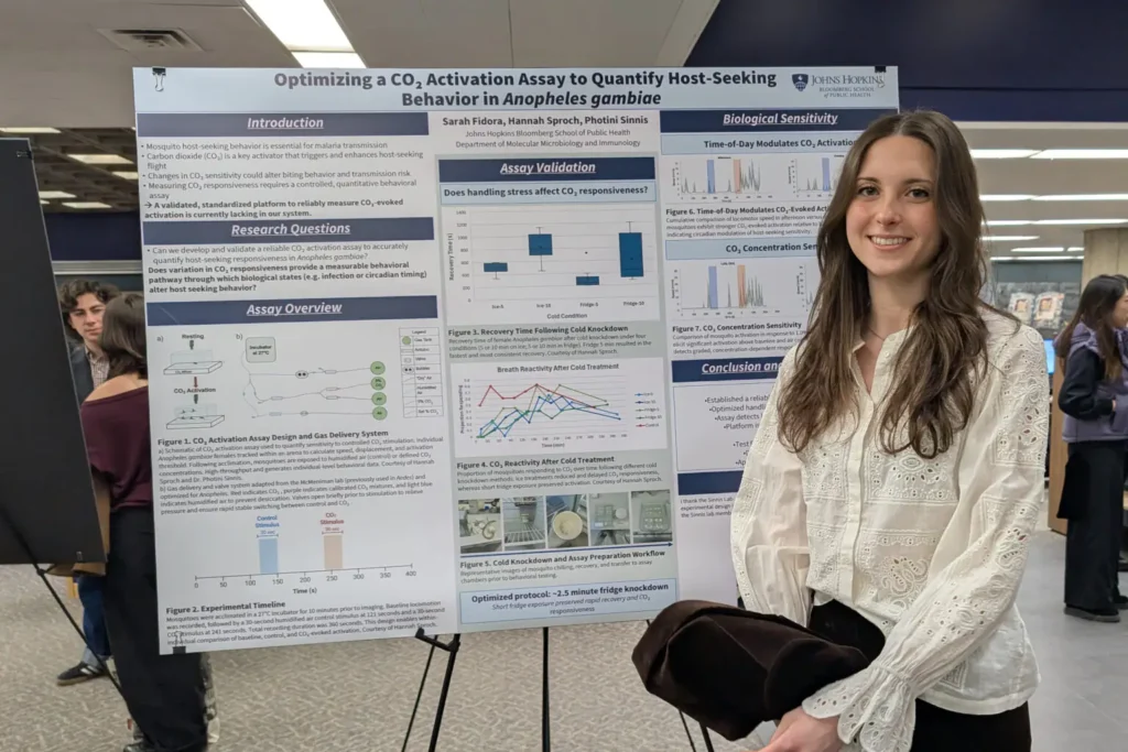Sarah Fidora, a third-year student studying applied genetics and biotechnology with double minors in immunology and philosophy, shared research she conducted over the summer at Johns Hopkins University on Anopheles gambiae, the mosquito species that serves as the primary vector of malaria transmission. For Sarah, the Colloquium offered a rare opportunity to present work done outside of U of T. “I wanted to participate because I wanted an opportunity to share the research that I did, especially given that it wasn’t conducted at U of T, so there wasn’t an allocated place for me to share my research,” she said.