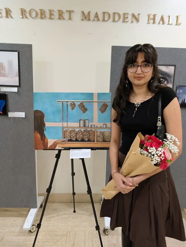 For student artist Radhika Punchhi, the theme inspired her to paint a scene with special meaning. Her piece depicts a woman standing alone beside a street food cart, a self-portrait that explores her experience of cultural belonging. “I specifically chose this type of food because when it’s eaten, you usually enjoy it with a bunch of people — it’s street food, there’s a lot of interaction,” she explained. Radhika’s parents had immigrated to Canada and then moved back to India. The painting reflected her experience of being back in her country of ethnic origin. “I specifically made the subject a lone figure because it was based on my experience of feeling lonely in my own cultural makeup,” she said.