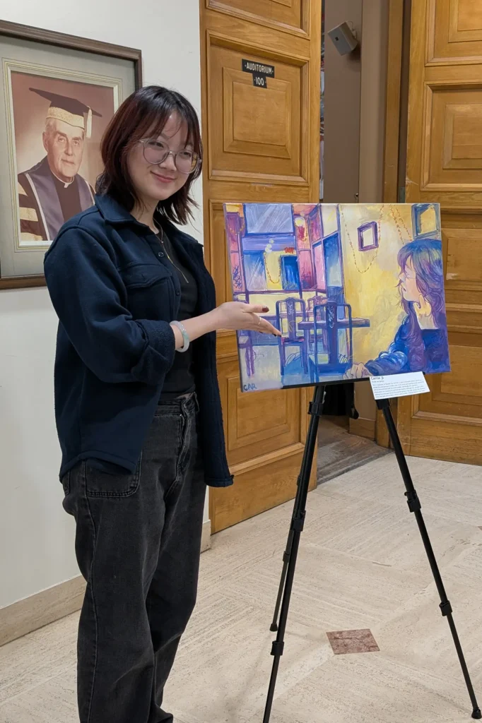 St. Michael’s student Carrie Ji took a more sentimental approach, painting a scene from a photograph taken of her in a café — a place she came to realize had quietly anchored many of the significant moments of her life. “The theme was really special to me, especially as someone who’s very nostalgic,” she said. “Having the chance to convince myself to paint something like this for an exhibit really drove me to create something meaningful.”