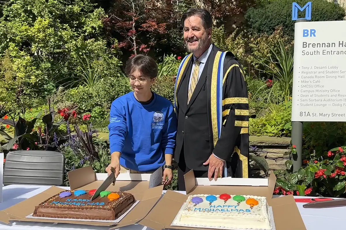 The celebrations continued on Elmsley Place where President Sylvester and St. Michael’s College Student Union (SMCSU) VP of Spiritual Life Ernesto Perez Viyella ceremoniously cut the Michaelmas cake with a sword.
