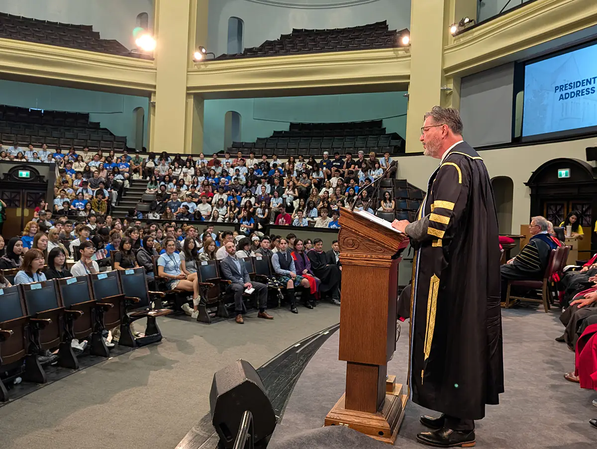 USMC celebrated Invocation on August 25th in U of T’s Convocation Hall. The event was marked by an academic procession of faculty, librarians, and staff as well as various festivities for new students. Dr. Mark McGowan delivered remarks to the audience of over 500 incoming students. Members of the Student Life team opened orientation for incoming students with presentations about orientation week and a pep rally.